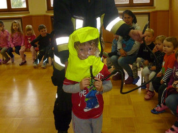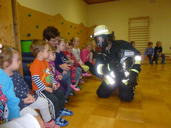 Den Kindern wurde gezeigt, wie ein Atemschutzgeräteträger aussieht, und dass man sich nicht vor einer solchen Gestalt fürchten sollte. Nachdem dann die Kinder neugierig einige Fragen an 3 Freiwillige Feuerwehrmänner richteten, wurde noch ein Hausalarm geübt. Die Kinder hatten so auch viel Spaß bei dem Übungsalarm und konnten so spielerisch das Verhalten im Ernstfall sehen und nachspielen. Nach dem aufregenden Auftritt eines Atemschutztruppes und dem Übungsalarm durfte der gesamte Kindergarten inklusive der Krabbelgruppe, die auch sehr interessiert war, das Löschgruppenfahrzeug der Feuerwehr Neudorf ansehen und etliche Fragen über die Einsatzmittel und -möglichkeiten stellen. Danach hat man den aufregenden Vormittag in Ruhe und in Gruppen beenden können.