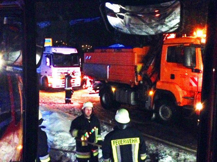 Bericht:Beim Eintreffen unserer Feuerwehr am Einsatzort zeigte sich folgendes Bild: Auf der spiegelglatten Fahrbahn der B533 stand ein Gefahrguttransporter quer, dessen Fahrer bereits von Rettungssanitätern versorgt wurde.