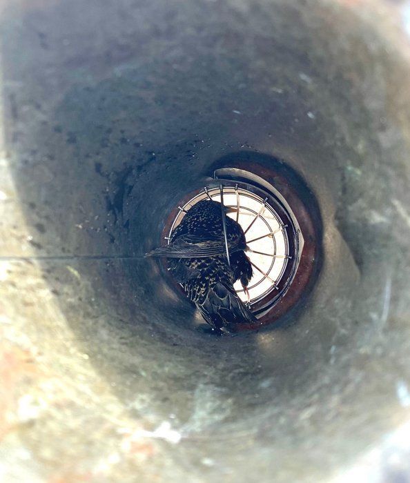 Bericht: Geräusche aus der Dachrinne - ein Vogel hatte sich im Rohr verklemmt und war gefangen - Das Tier wurde von uns befreit und in die Freiheit entlassen.