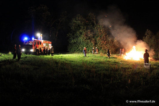 Während sich die Jugendlichen nach getaner Arbeit ihrer Schutzausrüstung entledigen wollten, ließen wir die Sirene durch einen Lautsprecher ertönen. Die Jugendfeuerwehrler/innen mussten zu ihrem ersten Einsatz ausrücken. Einsatzstichwort war der Brand eines PKW beim landwirtschaftlichen Anwesen Weber in Lichteneck. Am Einsatzort erkundeten und arbeiteten die Jugendlichen wieder selbstständig. Statt dem Brand wurde ein Schmorbrand festgestellt und der PKW musste gekühlt werden. Zur Absicherung wurde dennoch der Schaumangriff aufgebaut, um Notfalls einen entstehenden Brand schnell unter Kontrolle zu bringen. In diesem Zuge erhielten die Jugendlichen eine kurze Wiederholung bezüglich des Schaumangriffes durch den Maschinisten. Beim Abrücken wurden wir von der Leitstelle Passau (dargestellt durch Kommandant Scheichenzuber) zur Erstversorgung eines gestürzten Radfahrers alarmiert. Als wir die Unfallstelle süd-östlich von Neudorf erreichten, wurde ein PKW mit darunter eingeklemmten Fahrrad und den wild umherlaufenden Fahrer des PKW´s erblickt. Beim Erkunden konnte vom Gruppenführer eine verletzte Person vor dem PKW aufgefunden werden. Daraufhin wurde augenblicklich ein Rettungswagen mit Notarzt alarmiert. Zu selben Zeit wurden alle umliegenden Straßen gesperrt, ein Einweiser wurde zur Bundesstraße geschickt und auch mit der Erstversorgung wurde bereits begonnen. Zur Überraschung der Feuerwehranwärter/-innen kam tatsächlich ein Rettungswagen mit Blaulicht und Martinshorn zur Unfallstelle, worüber sie sehr staunten. Jedoch wurde konzentriert weiter gearbeitet und die verletzte Person wurde mit den notwendigen Angaben an das Rettungsdienstteam übergeben. An dieser Stelle wurde der Einsatz beendet und alle Jugendlichen zusammengerufen. Jetzt erklärte ein Mitglied des Rettungsdienstes, was im Ernstfall weiter mit dem Verletzten geschehen würde und worauf man bei Erster Hilfe bzw, der Erstversorgung achten muss. Anschließend fuhren alle Beteiligten der Einsätze zum Feuerwehrhaus, wo gemeinsamen gegrillt wurde. Auch das Team vom Bayerischen Roten Kreuz blieb noch lange da und tauschte mit den Jugendlichen Erfahrungen aus. Nach den notwendigen Hausarbeiten wie beispielsweise Tische abräumen und Geschirr abwaschen wurden die Feuerwehranwärter-/innen ihres Alters entsprechend aufgeteilt. Der Großteil der Gruppe verkroch sich in ihre Schlafsäcke und konnte noch einen Film ansehen. Die Älteren saßen draußen bei den Erwachsenen und hörten sich deren Geschichten und Erzählungen an. Gegen 22:20 Uhr ertönte wieder die Sirene durch die Lautsprecher, dieses Mal mit Einsatzstichwort „B1 Brand Gebüsch zwischen Neudorf und Lichteneck“. Am Einsatzort (Sonnwendfeuerplatz) war der Grundstücksbesitzer erstaunt über das Feuerwehraufgebot, denn lt. seinen Aussagen hatte er das Feuer bei der Stadt angemeldet. Während die Gruppenführer dies überprüfte, wurden Wasserleitungen aufgebaut, damit man –sollte es erforderlich werden- löschen könne. Um dies in der Dunkelheit bewerkstelligen zu können, ordneten die Gruppenführer an, den Lichtmast am Fahrzeug und das große Stativ mit Lichtaufsatz aufzubauen. Das Feuer ließ man kontrolliert abbrennen und fuhr dann wieder zurück auf die Wache, an der man gegen 23:00 Uhr die Einsatzbereitschaft wieder hergestellt hatte. Anschließend begann die Nachtruhe und die Jugendlichen erholten sich von den spannenden, jedoch auch anstrengenden vorherigen Stunden.