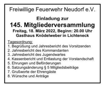 Neudorf. Zur 145. Jahreshauptversammlung hatte die Freiwillige Feuerwehr Neudorf ihre Mitglieder ins Gasthaus Knödelweber eingeladen. Der 1. Vorsitzende Tobias Lendner konnte als Ehrengäste den 1. Bürgermeister der Stadt Grafenau Alexander Mayer, die Stadträte Helmut Binder und Korbinian Rank sowie den Ehrenvorsitzenden Alois Blöchl, Kreisbrandmeister Robert Stöckl und Kreisbrandrat Norbert Süß begrüßen. Auch eine Abordnung der Partnerfeuerwehr Oberkappel war gekommen. In seinem Rückblick ging Lendner auf das abgelaufene Vereinsjahr ein. Aufgrund der Beschränkungen in der Pandemie konnten viele Veranstaltungen nicht in der gewohnten Weise durchgeführt werden. Lediglich der Jahresabschlussgottesdienst und eine Christbaumversteigerung to go waren möglich. Im aktuellen Jahr sind wieder der Gottesdienst am Geistlichen Stein im Juli und das Gartenfest vom 19. bis 21. August geplant.