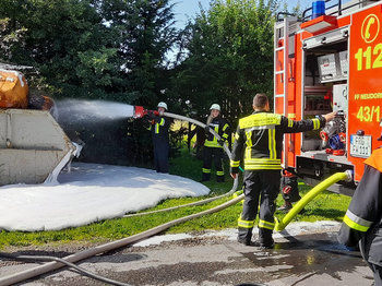 Bericht: B4 Brand Industriegebäude - Gemeinsam mit 16 weitere Feuerwehren wurden wir nach Schönanger alarmiert. Bereits beim eintreffen der ersten Kräfte stand die Halle in Vollbrand. Unsere Tragkraftspritze (Pumpe) war eine von Sechs, die Löschwasser zur Einsatzstelle förderten. Des Weiteren wurden wir für die Kühlung des Stickstofftanks mit unserem Wasserwerfer und Atemschutz eingeteilt. Trotz der rasch eingeleiteten Löscharbeiten brannte die Halle Großteils bis auf die Grundmauern nieder – verletzt wurde niemand. Der im Gebäude untergebrachte Stickstofftank konnte rechtzeitig gesichert und ausreichend gekühlt werden. Insgesamt waren über 400 Einsatzkräfte aus dem ganzen Landkreis vor Ort.